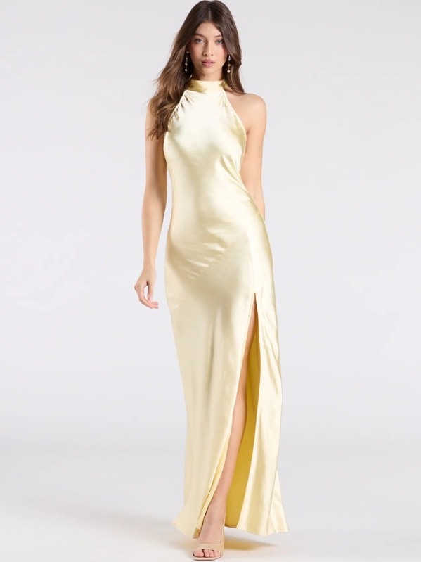 The Amira satin dress is where elegance becomes effortless. Designed with a head-turning open back design and high front slit, this floor-length dress boasts plenty of allure!