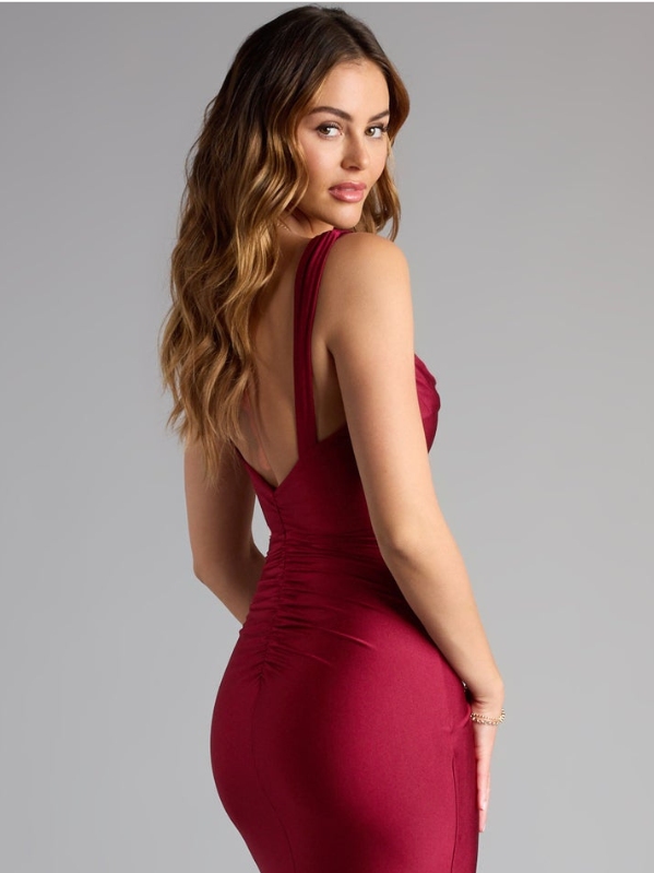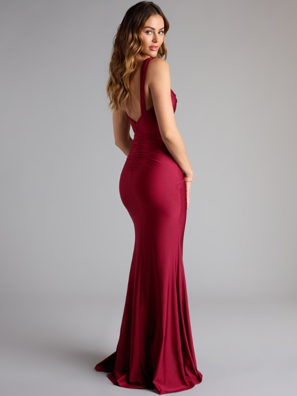 Make it an unforgettable night in the Brielle satin dress at galas or black-tie events. The sleeveless dress captivates with an alluring open-back design and high front slit along the figure-enhancing mermaid silhouette. Pair with earrings and heels.