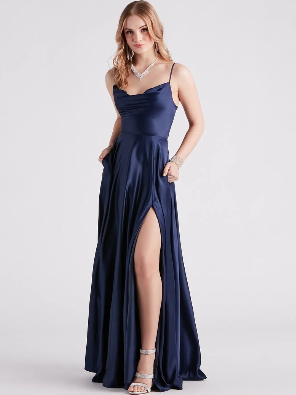 - Sleeveless, cowl neck, adjustable spaghetti straps