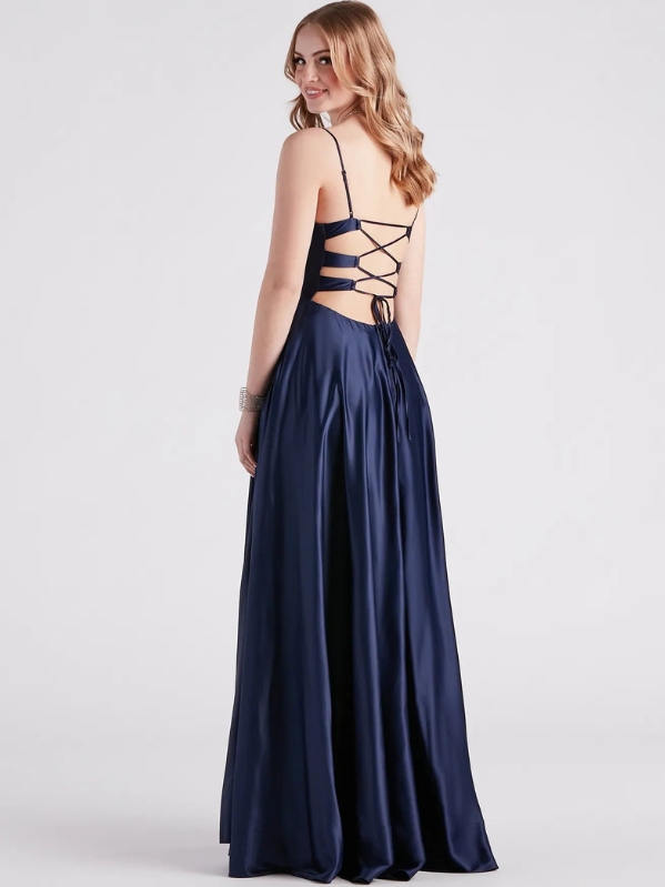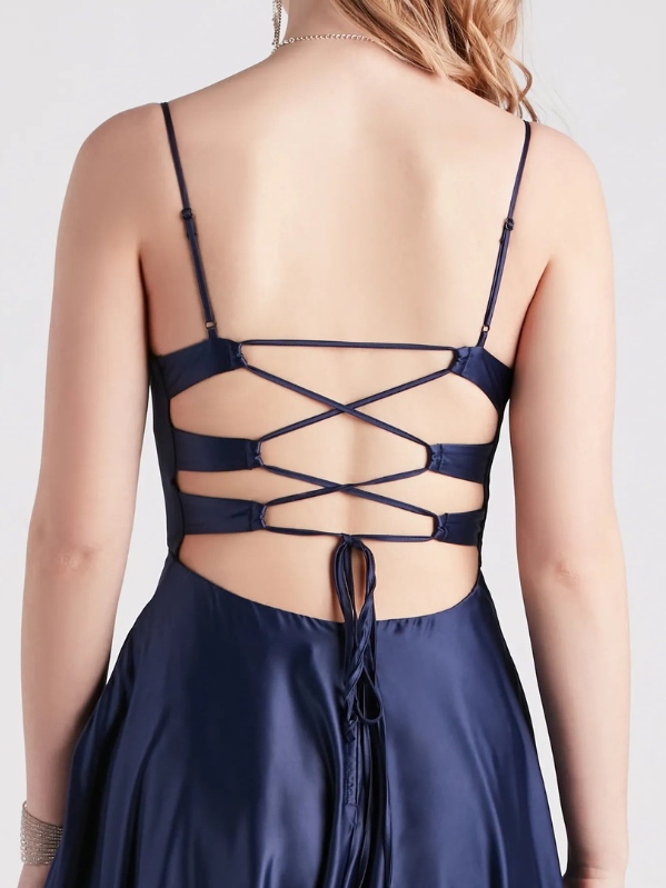 - Form-fitting bodice, open-back, lace-up closure