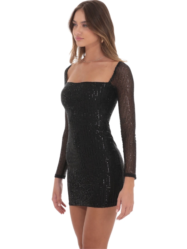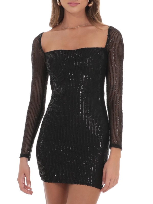 Sparkling accents on our high-end pink sequin fabric, this dress is the epitome of glamorous. Features a trendy square neckline, long sleeves and a flattering body con fit.