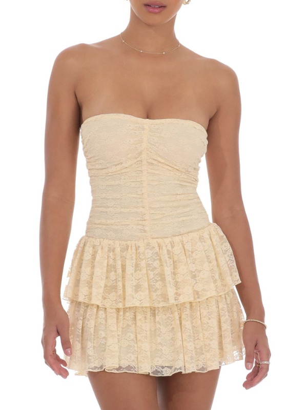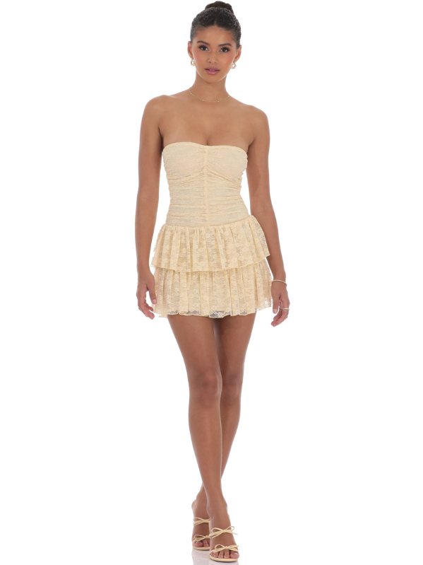 Quinta Ruffle Floral Lace Dress in Beige